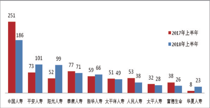 人身保险公司涉嫌违法违规投诉量居前10位分别为:中国人寿186件;平安人寿101件;阳光人寿99件;泰康人寿71件;新华人寿66件;太平洋人寿49件;人民人寿38件;太平人寿28件;富德生命26件;华夏人寿23件。人身保险公司涉嫌违法违规投诉量增长较快的有:阳光人寿增加47件,同比增长90.38%。