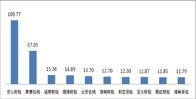 2018年上半年,财产保险公司亿元保费投诉量(3)平均值为4.31件/亿元。其中,亿元保费投诉量居前10位分别为:安心财险109.77件/亿元;泰康在线57.05件/亿元;诚泰财险15.36件/亿元;渤海财险14.89件/亿元;众安在线13.70件/亿元;珠峰财险12.70件/亿元;利宝保险12.30件/亿元;亚太财险11.87件/亿元;燕赵财险11.85件/亿元;海峡保险11.79件/亿元。