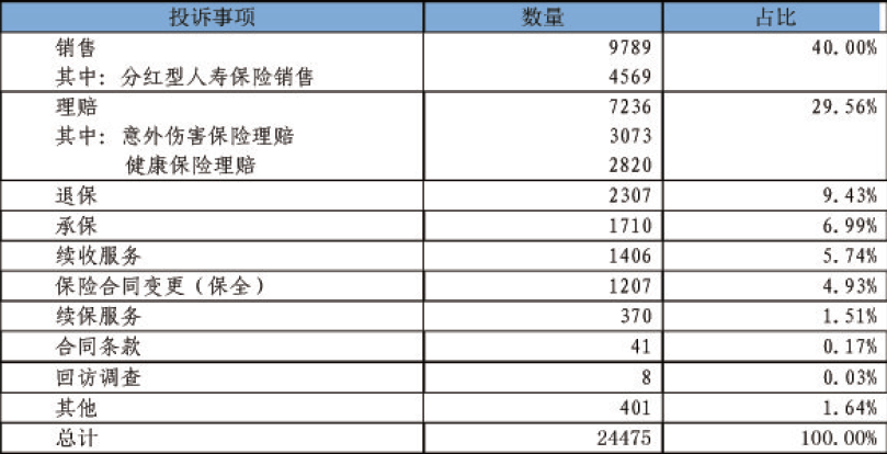 投诉集中反映分红型人寿保险销售纠纷、意外伤害保险理赔纠纷和健康保险理赔纠纷等。